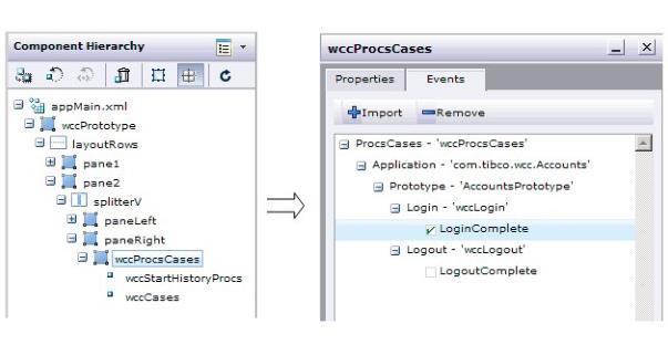 • WorkQsItems - composite of the work queue list component (see UserWorkQs) and the work item list component (see WorkItems)To configure access to the functions available from each component in a composite, you must drill down to the desired component under the composite in the Component Hierarchy, then configure the appropriate property.For example, the ProcsCases composite component needs to subscribe to an event to cause it to display, as follows: