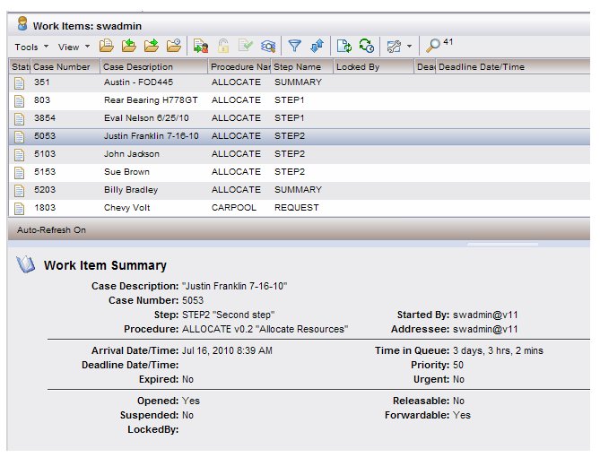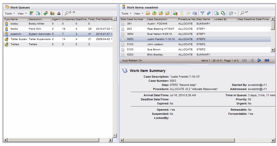 • displays the work item list in the upper right part of the window — by default, the WorkItems component subscribes to the “List Item Select (single click)” event on the UserWorkQs component, causing the work item list to appear upon a single click of a work queue.