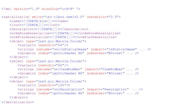 2. Modify the callout handler (e.g., ColumnsCalloutHandler.js) to fit your needs.The original SampleCalloutHandler.js file that you copied contains sample implementations of each of the available callout methods.There is also a componentName parameter that specifies the specific instance of the component the method is affecting. This can be useful in WCC custom applications where you may be displaying multiple lists at one time, and would like to modify the filter, sort, or columns on only one of them.The jsx3.xml.Entity object is a TIBCO® General Interface class that is a wrapper of the native browser XML node class. This class provides methods for querying, traversing, and creating XML entities (see the TIBCO® General Interface documentation for more information). The object is a Document Object Model (DOM) class that provides methods to add, find, modify, or delete XML values in an XML document. Use these methods to modify the incoming XML so that the desired filter, sort, or columns are displayed.When customizing the callout handler, you must also register the callout method with the application CalloutController by adding the method to the init (constructor) method. It must be in the form: