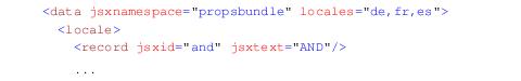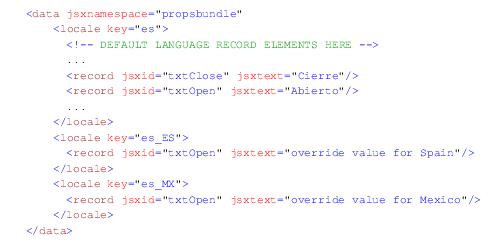 6. Translate the value of every jsxtext attribute in the newly created file to language-specific values.For each country-specific locale, create a <locale> element (within the root <data> element) and specify the locale key as the value of the key attribute. Insert record elements into each new <locale> element, that are to “override” default language records, with matching jsxid attribute values.![]()