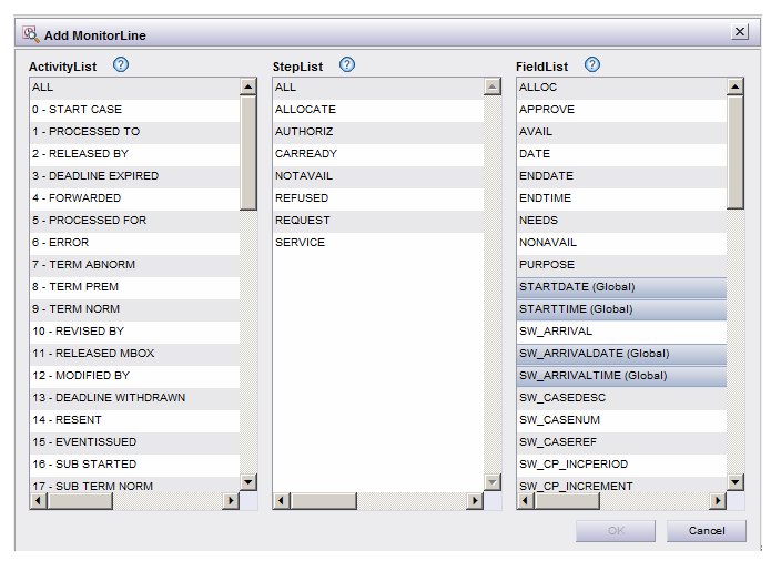 This causes the Add MonitorLine dialog to be displayed, which is used to define the <MonitorLine> element in the MER XML. This dialog displays a list of all activities (audit events), steps, and fields that are defined in the previously selected procedure: