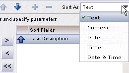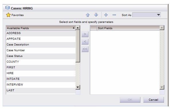 − All fields can be moved from the Sort Fields list to the Available Fields list by clicking on the “<<“ button.The order in which the sort fields are listed in the Sort Fields window specifies the priority of the sort. If you have multiple sort fields listed, all cases will first be sorted by the first sort field, then they will be sorted by the next sort field, and so on. For example, if you specified “Case Status” as the first sort field, then “Started Date/Time” as the second sort field (both ascending), the cases would be sorted in the following fashion: