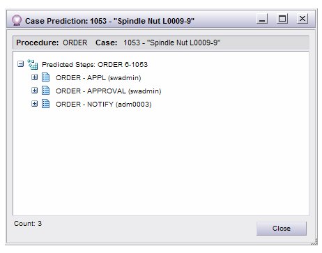Case prediction provides the means for predicting the expected outcome of a live case. Running the case prediction function causes a list of “predicted work items” to be returned that represent the work items that are currently due (outstanding work items), as well as the work items that are expected to be due in the future.