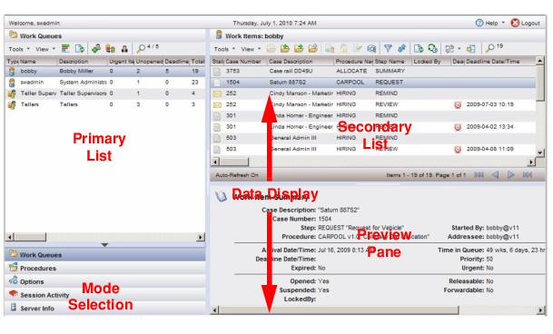 This section always contains either the work queue list or procedure list, depending on the selection made in the Mode Selection section. If one of the other mode selections are made (Options, Session Activity, or Server Info), this section will still display either the procedure or work queue list, whichever was most recently selected.