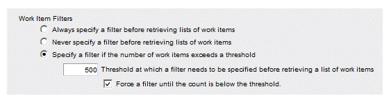 − Specify a filter if the number... - This radio button is used in conjunction with the Threshold field below the Work Item Filters radio buttons. If this radio button is selected, the work item list is displayed only if the number of work items in the work queue does not exceed the number in the Threshold field. If the number exceeds the threshold, the filter dialog is displayed first, allowing you to apply a filter before displaying the work item list.If you specify a threshold value, you can also force the user to filter the work items until the number of work items is below the threshold value. To do this, select the Force a filter... check box. This causes the filter dialog to be displayed, and forces the user to specify a filter that brings the number of work items below the threshold before the work item list is displayed.