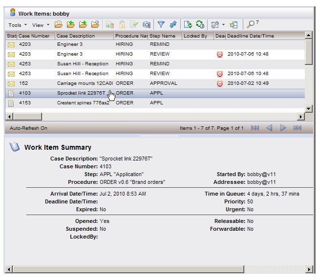 The user to whom the work item was sent. This is in the form username@node, where node is the name of the TIBCO iProcess Engine to which the iProcess Workspace (Browser) is connected (which is the same value in the Host Node column). False - The step definition in the procedure does not allow resulting work items to be forward.1 False - The work item is not currently locked by a user of an application other than the TIBCO iProcess Workspace (Browser) application.2 The user that started the case from which the work item was generated. This is in the form username@node, where node is the name of the TIBCO iProcess Engine to which the iProcess Workspace (Browser) is connected (which is the same value in the Host Node column). True - The work item is flagged as urgent. Whether or not a work item is urgent depends on a priority value given to the step when the procedure was created, as well as a configuration value specified in the server. That is, if the priority exceeds (is smaller than — with 1 being the highest priority) the configuration value, the work item is flagged as urgent.