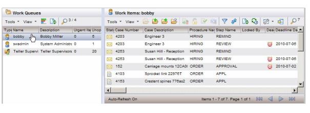 The window that is displayed depends on how your system has been set up. By default, the work item list is displayed. However, there is a user options setting that allows you to specify that if the number of work items in the queue exceeds a specified threshold, to automatically display the filter dialog first. This allows you to enter a filter expression to pare down the list before displaying it.For information about specifying whether or not to display the filter dialog first, see Filter Options.For information about using the filter dialog to filter the work item list, see Filtering a Work Item List.If the work item list is displayed, and the Filter icon on the work item list toolbar has a green check mark, the list is currently being filtered — the last filter expression applied to the work item list is in effect. For more information, see Filtering a Work Item List.Also, if the Sort icon on the work item list toolbar has a green check mark, the list is currently being sorted — the last sort criteria applied to the work item list is in effect. For more information, see Sorting a Work Item List.Information about each work item is provided in the columns of the work item list. The specific information that is displayed on your system will depend on how your system was set up — see Customizing Columns in a List.The effect of selecting an item from the work item list (i.e., single-clicking an item, or moving the highlight bar with the keyboard arrow keys) depends on whether or not the preview feature is turned on: