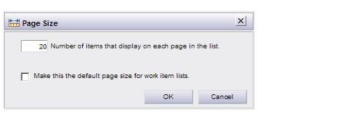 • #/##(##) - This format (e.g. 10/60(466)) is displayed if you have clicked the Find button and have entered search criteria to find work items in the list, but you are not using the “server filter” feature with the find function. For more information about using the find function and the server filter feature, see Finding Work Items in the Work Item List.When a list of work items is displayed on your screen, only a page of work items is displayed at one time. This is done to speed up the display, especially if there are a very large number of work items.The number of work items in a page defaults to 20. You can change this number by selecting Page Size from the View menu on the work item list (note that this function is disabled if the local find function is currently active — see Finding Work Items in the Work Item List). The following dialog is displayed: