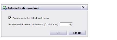 To enable auto-refresh, check the Auto-refresh check box, specify the number of seconds you would like between refreshes (the minimum you can specify is 5 seconds), then click OK.You can specify whether auto-refresh is enabled or disabled by default every time you log in. This is done on the Options dialog — see Auto-Refresh of Work Item Lists.