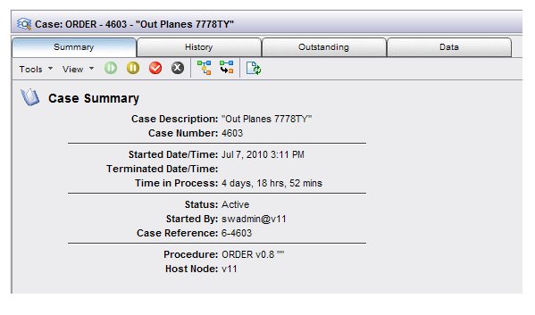 Opening a case causes the case details to be displayed. Case details are presented in a tabbed format that contains Summary, History, Outstanding, and Data tabs. As the names of the tabs imply, you can view a summary of the case, the case history details, information about the outstanding work items in the case, and view/modify the case data fields.