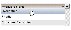 − Case Data Queue Parameter (CDQP) fields - These are similar to work queue parameter fields; they hold case data that was entered on a form associated with a work item.A system administrator must assign case data fields to CDQP fields to make those fields available for sorting (and filtering). If this has been done, the name of the field appears in the Available Fields list. In the following example, the Occupation field is a case data field that appears on a form and that has been designated a CDQP, causing it to appear in the list: