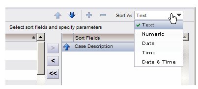 To change the priority, select the desired sort field(s) in the Sort Fields window, then click on the “+” or “-” button to move the field(s) up or down in the list.When a sort field is added to the Sort Fields list, it is ascending by default, which is denoted by the up arrow next to the field name:To change the sort direction, select the desired sort field(s) in the Sort Fields list, then click on the up or down arrow buttons on the sort dialog: