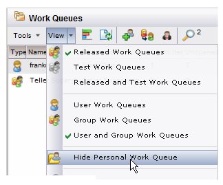• Redirection Access - Although this does not give you direct access to another work queue, it causes work items that were originally destined to another work queue to be redirected to your work queue instead. A work queue supervisor must set up a “redirection schedule” that specifies the duration of the redirection. For more information about redirection, see Redirecting Work Items to Another Work Queue.If you have the authority to change the default, the work queue list View menu will contain either the Hide Personal Work Queue or Show Personal Work Queue selection (depending on its current state):