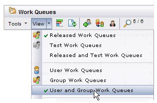 You can list the user and/or group work queues to which you have access by making selections from the View menu on the Work Queues window: