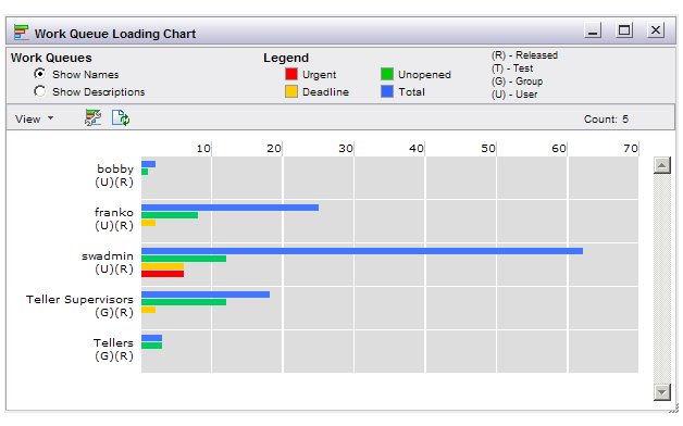 If your personal work queue is hidden by default on the work queue list and you do not have the authority to change the default via the Show / Hide Personal Work Queue selection on the work queue list View menu, your personal work queue is also hidden on the Work Queue Loading Chart. For more information about hidden work queues, see Hidden Personal Work Queues.Selections are available on the View menu that allow you to display only the released work queues, only the test work queues, or both the released and test work queues. You can also use selections on the View menu to display only user work queues, only group work queues, or both user and group work queues.The work queue loading chart can be refreshed at any time by either selecting Refresh Work Queues on the View menu, or by clicking on theicon on the toolbar.