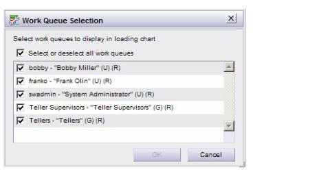 The first time you display the work queue loading chart, it will list all work queues to which you have access. You can, however, choose to display only a subset of the available work queues by selecting Select Work Queues from the View menu, or by clicking theicon on the Work Queue Loading Chart dialog. The following dialog is displayed: