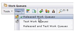 • Only “Released Work Queues” or “Test Work Queues” has been selected from the View menu. (For information about displaying released and/or test work queues, see Released vs. Test Work Queues.)