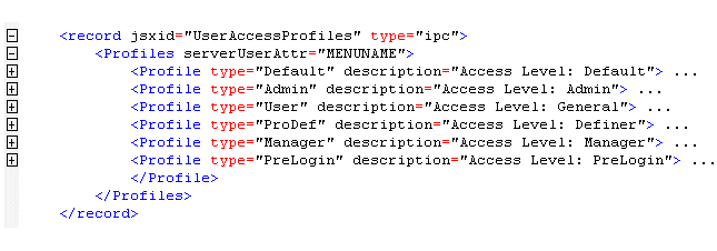 The user access profiles are defined using the UserAccessProfiles record in the ClientInstallDir\JSXAPPS\ipc\userAccessProfiles.xml file.