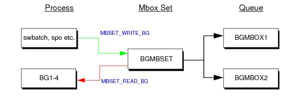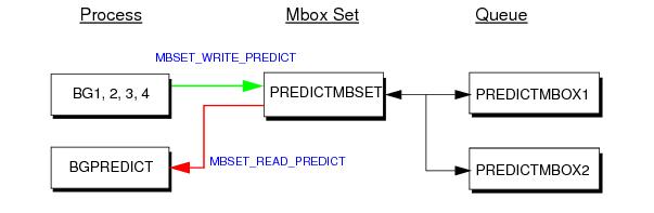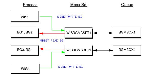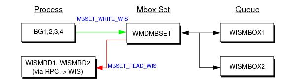 3. Both WISMBD processes are configured to read messages from the WMDMBSET Mbox set. (Each WISMBD process then forwards each message to the appropriate WIS process via RPC.)The following diagram shows how the BG processes send messages to the BGPREDICT process using the default configuration.