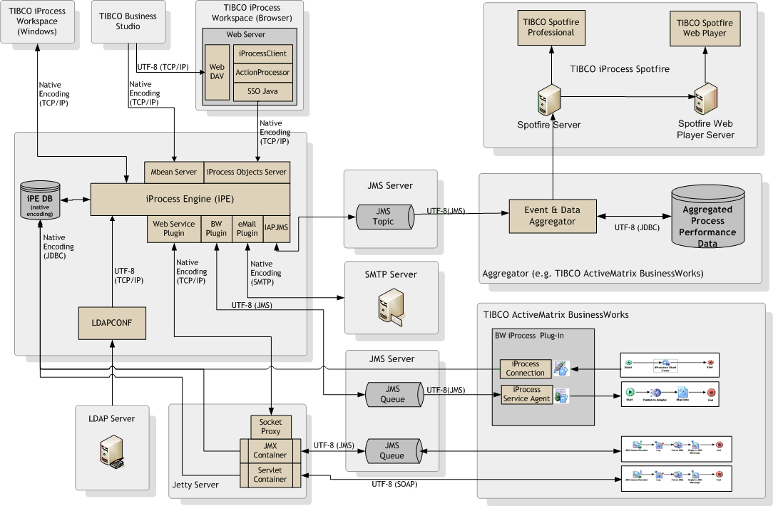 | • | The diagram indicates that some components, including the iProcess Engine can use either native encoding or UTF-8. Depending on the encoding used by other components in the iProcess Suite, the iProcess Engine performs the necessary data conversions. For information about setting the encoding attributes for iProcess components, see the documentation supplied with the components. |