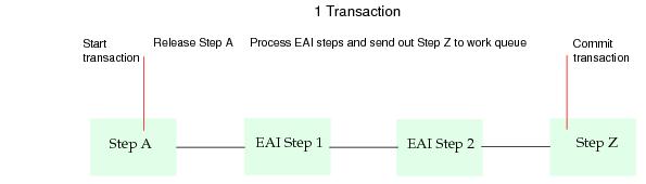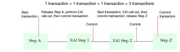 If the EAI step definition is defined to be delayed release, the actions of the EAI step are not processed immediately when the EAI call-out completes. They are processed when a release instruction is given to the BG process at a later time and in a separate transaction.