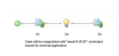 A case can be suspended by linking to the left of an Event from the release action (i.e. the right hand side) of a Step. When the Step is released this branch of the case is suspended, and an entry is written to the Audit Trail to show that an event is outstanding.