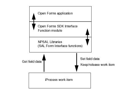 • Interface Function module. This is a source code module that you can include in the build of your Open Forms application. It provides interface functions (openform_xxx()) which you can call to get and set a work item’s field data and keep or release the work item. See Developing the Open Forms Application.