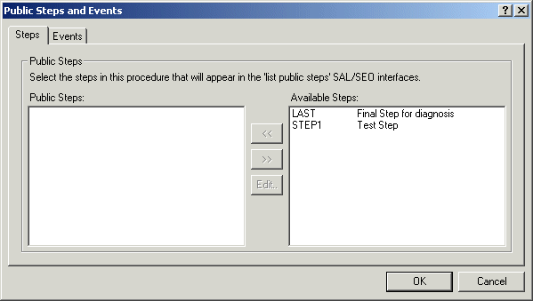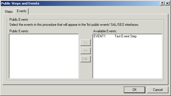 1. In the TIBCO iProcess Modeler, make sure you have your procedure open and then click Procedure > Public Steps.The Public Steps and Events dialog is displayed.