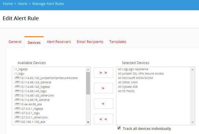 Available Devices text block, select the appropriate log sources (i.e., devices) you want to monitor and be alerted on when an alert rule is triggered.