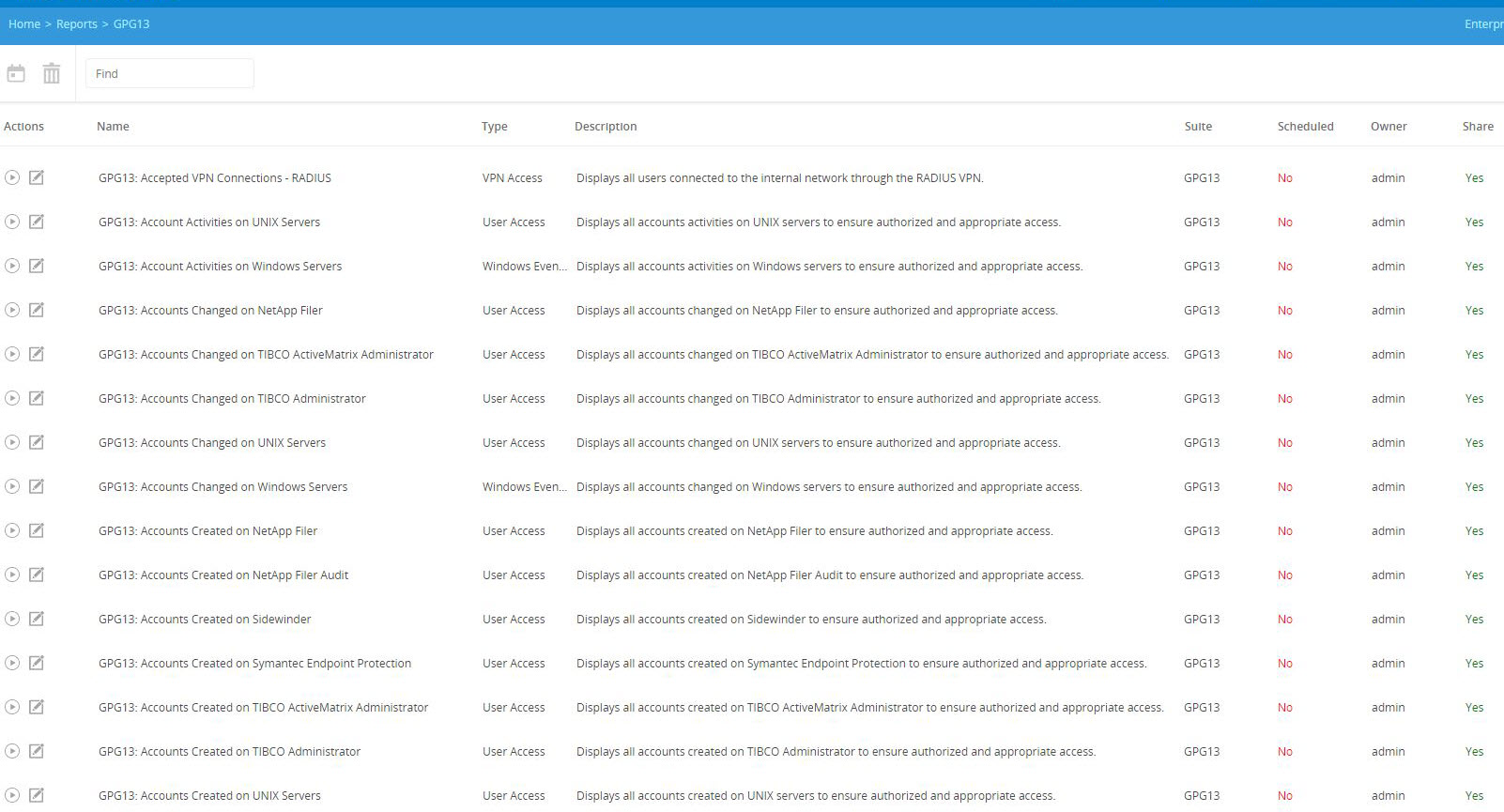 The following figure shows a cropped list of the Compliance Suite reports loaded from the GPG13 XML file.