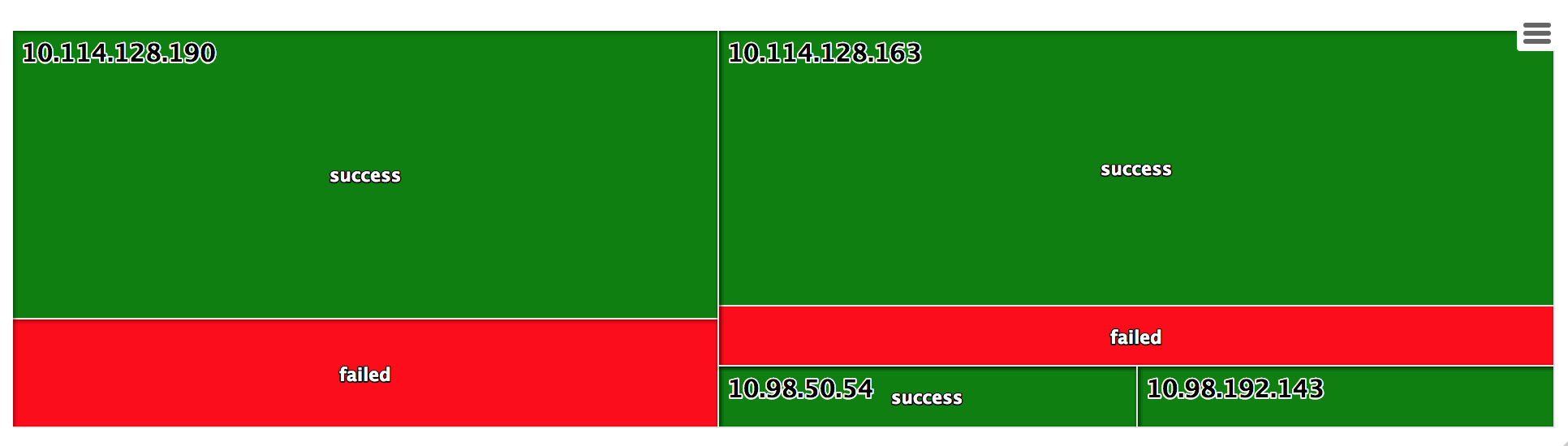 use LogLogic_Appliance | GROUP BY ll_eventStatus, ll_sourceIP | COLUMNS ll_eventStatus, ll_sourceIP, count(*) as count | ll_eventStatus is NOT NULL | (ll_eventStatus != '')the Tile Name is ll_eventStatus, and the Tile Value is count(*). The treemap widget using the Color Axis value: