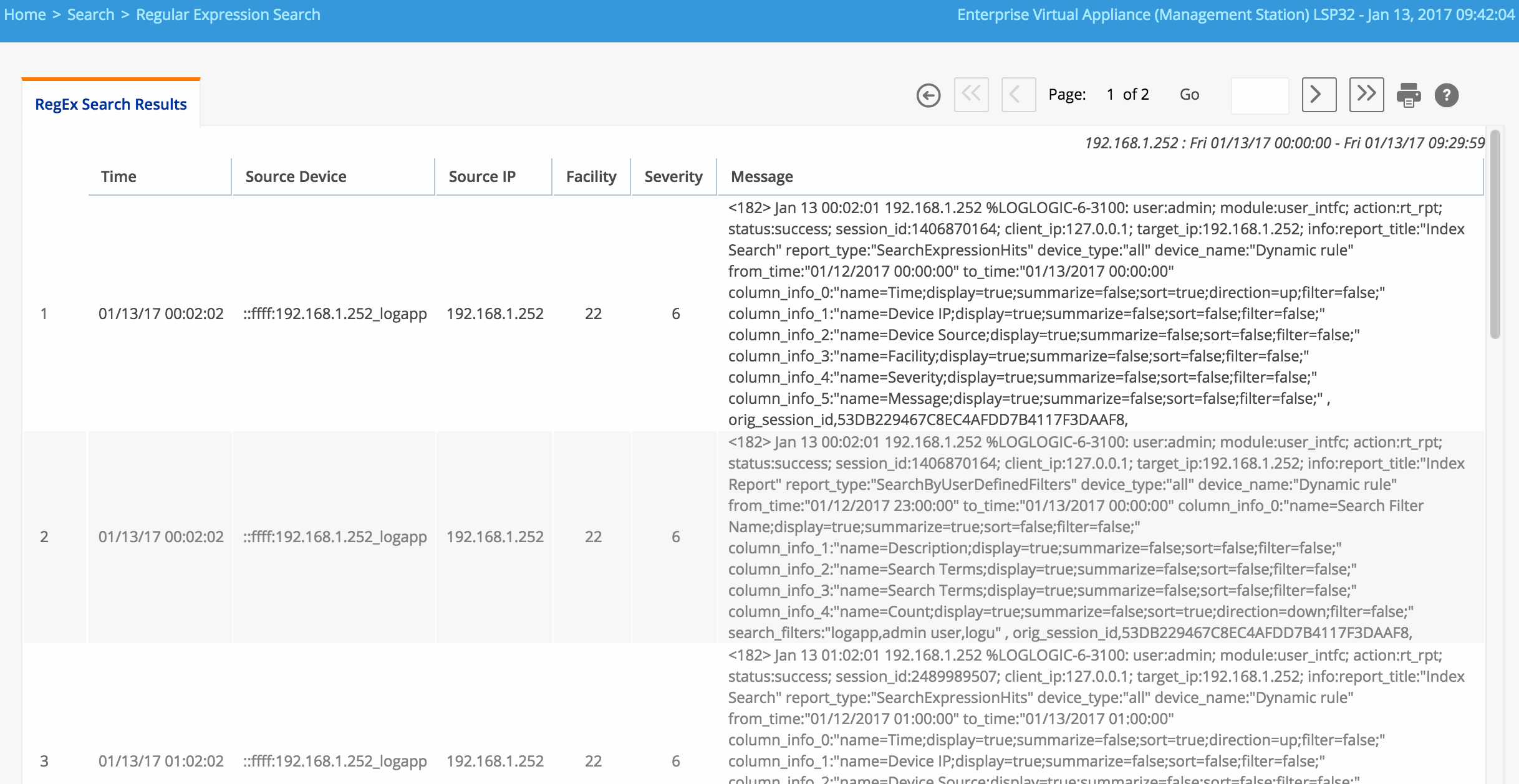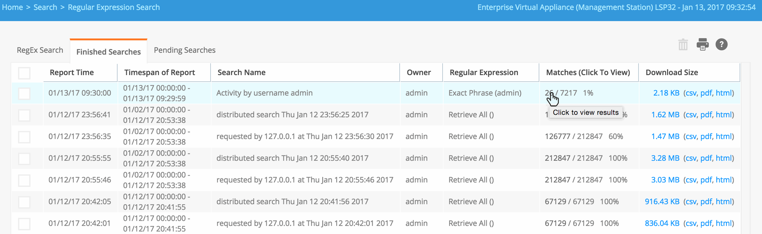 - Click the number of matches to see the detailed report of the logins by username admin.