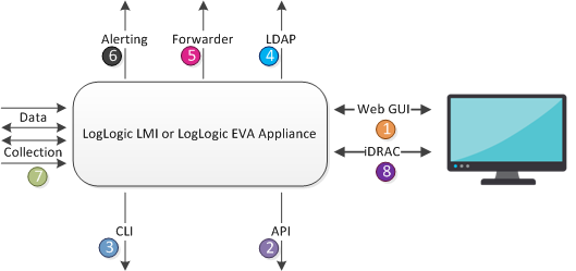 LogLogic® LMI is a self-contained appliance and is available as physical hardware or as a virtual appliance. Access is limited to a few areas. Most communication with LogLogic LMI is limited to data center services.