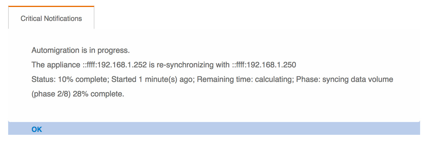 In this situation, a permanent failure of one of the appliances can result in data loss. If both nodes are mostly in sync, this resynchronization operation is relatively fast. However, if the data size difference is large, the operation time depends mainly on the network, CPU, and I/O bandwidth available. There are multiple phases involved in resynchronizing the failover, each with their own status and percentage to completion.