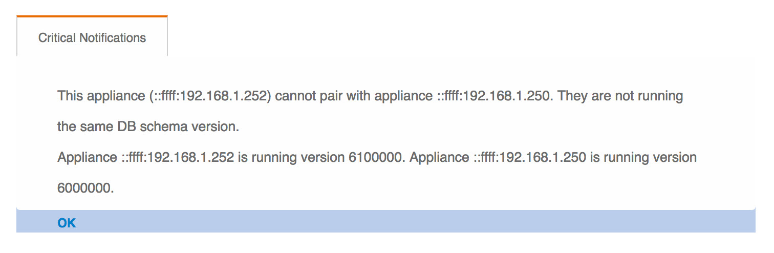 When the failover appliances appear to get out of sync, a message is displayed.