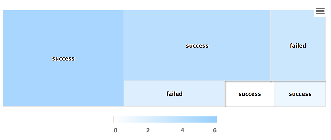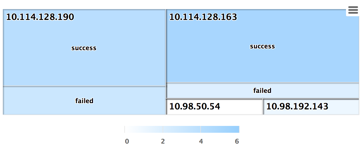 use LogLogic_Appliance | GROUP BY ll_eventStatus, ll_sourceIP | COLUMNS ll_eventStatus, ll_sourceIP, count(*) as count | ll_eventStatus is NOT NULL | (ll_eventStatus != '')the Tile Name is ll_eventStatus, and the Tile Value is count(*). The treemap widget using the Color Axis value:
