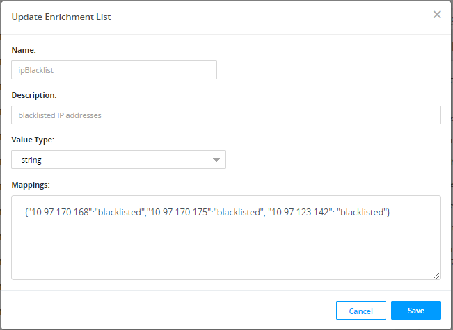 JavaScript must be enabled in order to use this site.Please enable JavaScript in your browser and refresh the page. Editing an Existing Enrichment List You can edit or delete an existing enrichment list from Management > Advanced Features > Enrichment Lists. You cannot edit or delete from the CLI. Editing an enrichment list by using the GUI To edit an enrichment list, perform the following procedure. To delete an enrichment list, select the list and click the delete icon. Procedure Navigate to Management > Advanced Features > Enrichment Lists. Click the name of the enrichment list and modify the required fields. Note: When the mappings are stored, any white space characters are removed. Therefore, you might see the mappings in one line. Click Save. Copyright © 2020. Cloud Software Group, Inc. All Rights Reserved.