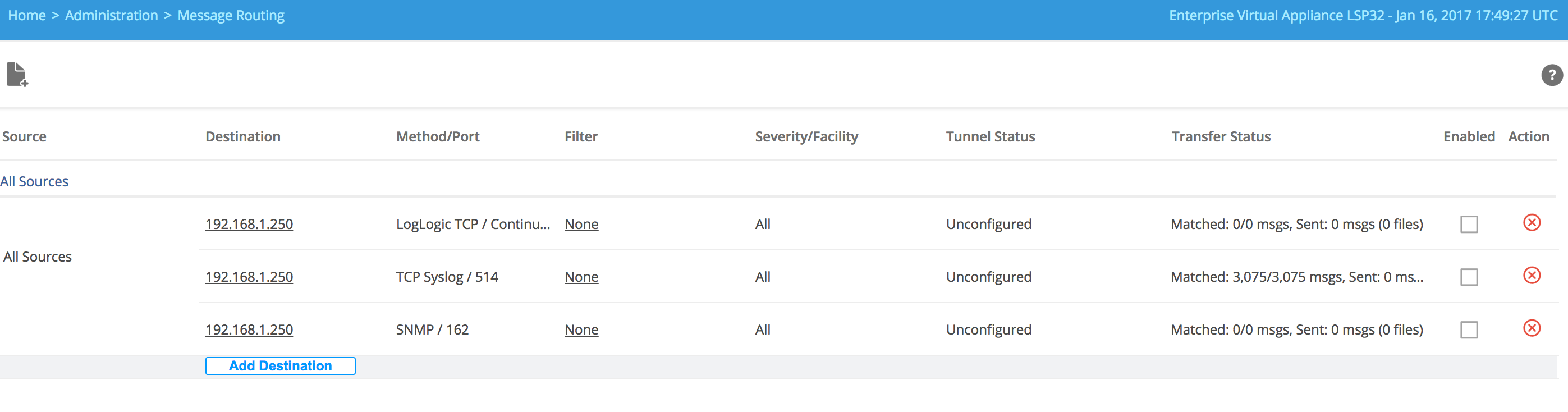 Add, three rules are added, one for each protocol type. Based on its log source type, a message is forwarded using one of the three routing rules. All syslog logs are forwarded using TCP protocol. All file-pulled logs are forwarded using LogLogic TCP protocol, and all SNMP trap messages are forwarded using SNMP protocol.