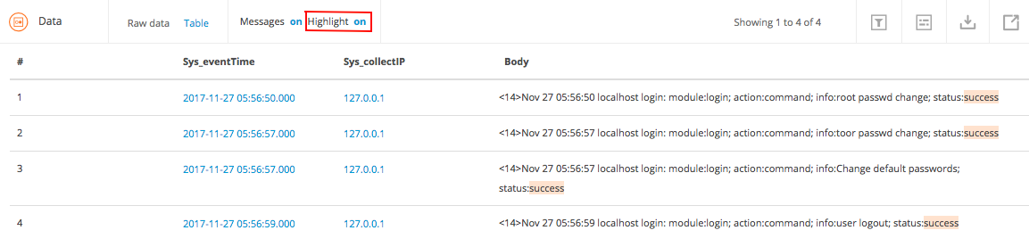 In the following illustration, when the search query is:use system | sys_body CONTAINS 'success'