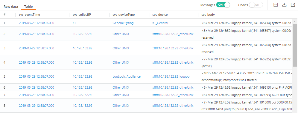 Click Messages on or off to show or hide the event body in the sys_body column.