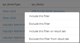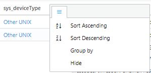 The following illustration displays the table showing filtered results for sys_deviceType='Other UNIX'.