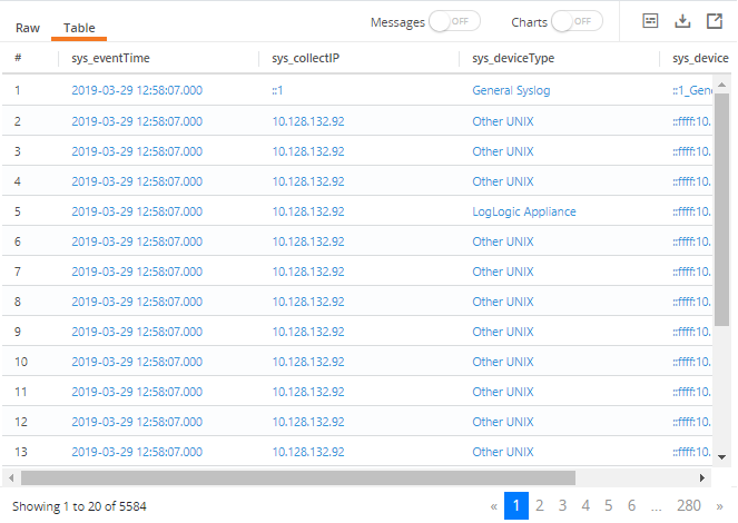 Note: To filter by any text in the body of the log events (sys_body column), turn the Messages view on, select the required text, and right-click the selected text.The Table view displays results based on the defined filters immediately. You can add multiple filters to fine-tune your search results. You can update the existing filter value. Click on the value to open the Enter value field. Update the value in the field and click