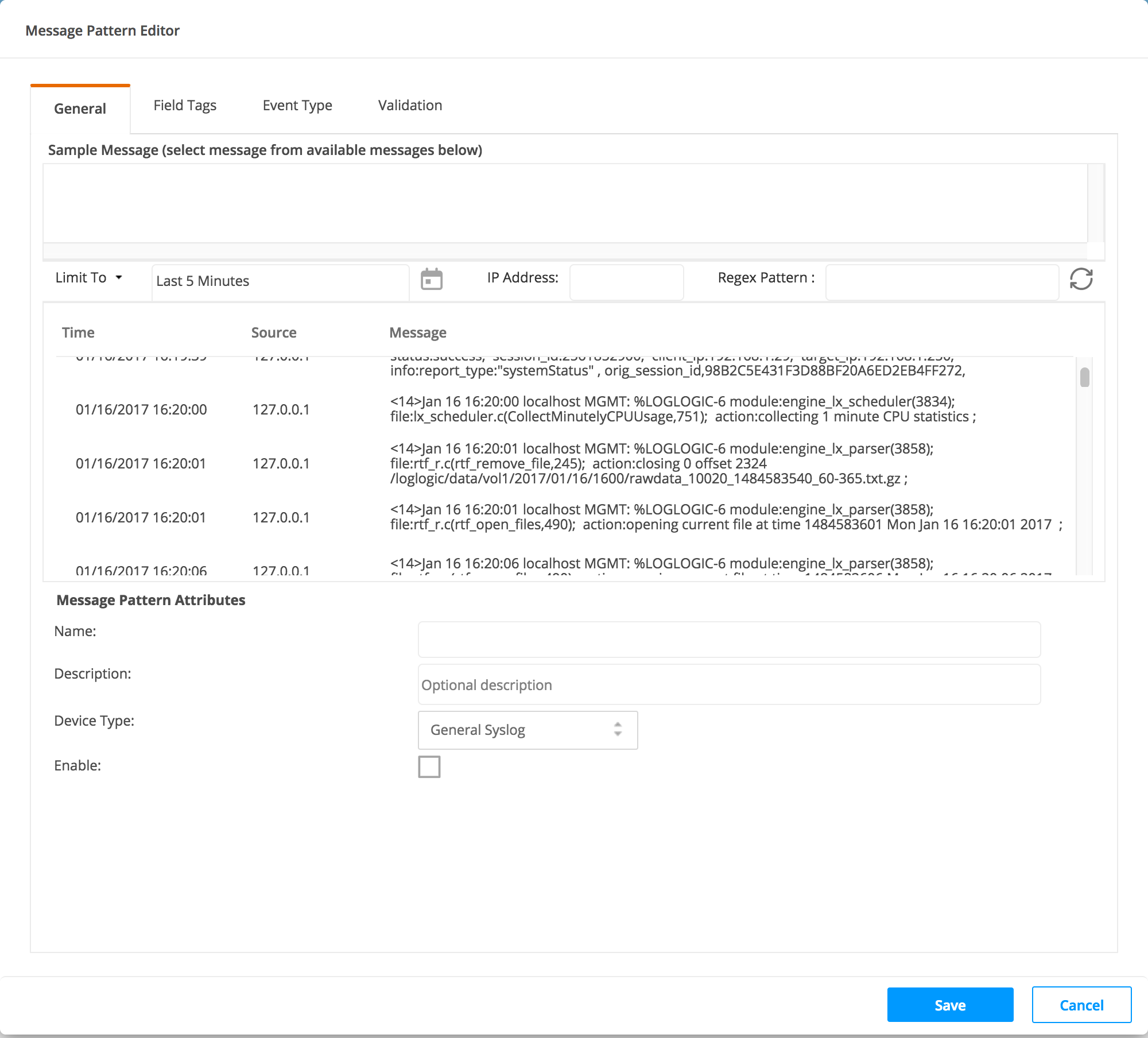 - On the General tab, highlight a message in the lower pane and click it. Your selection appears in the Sample Message pane.