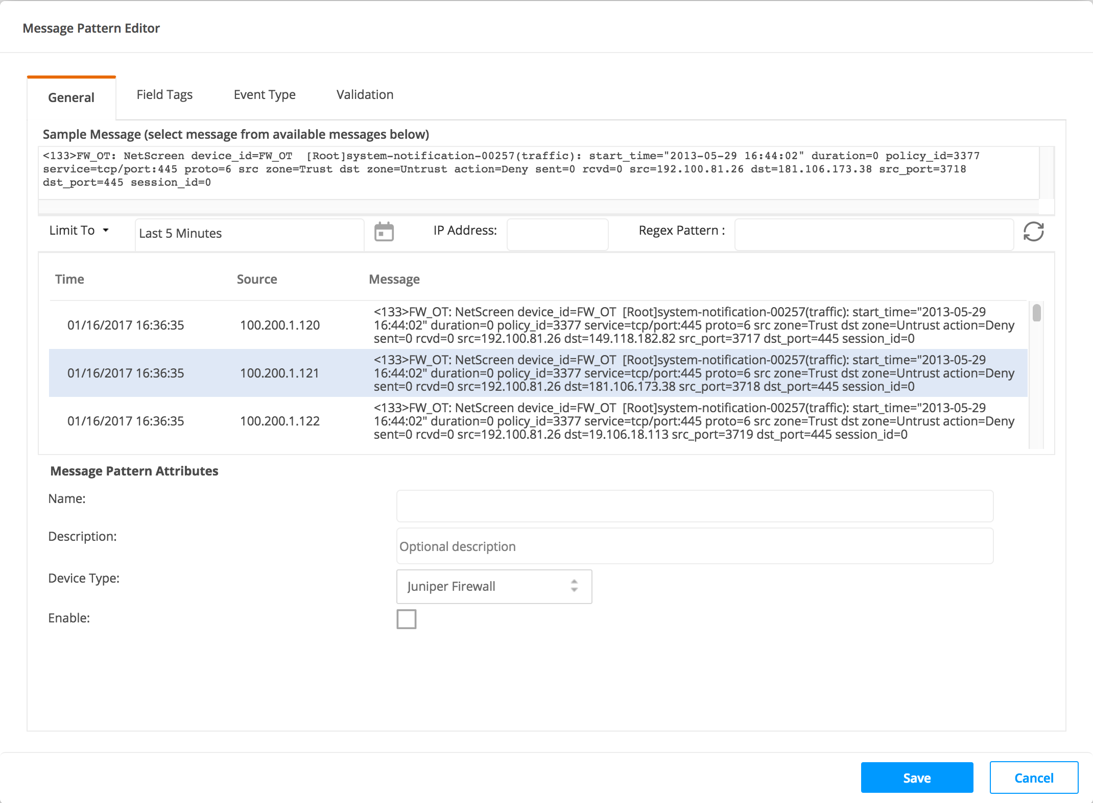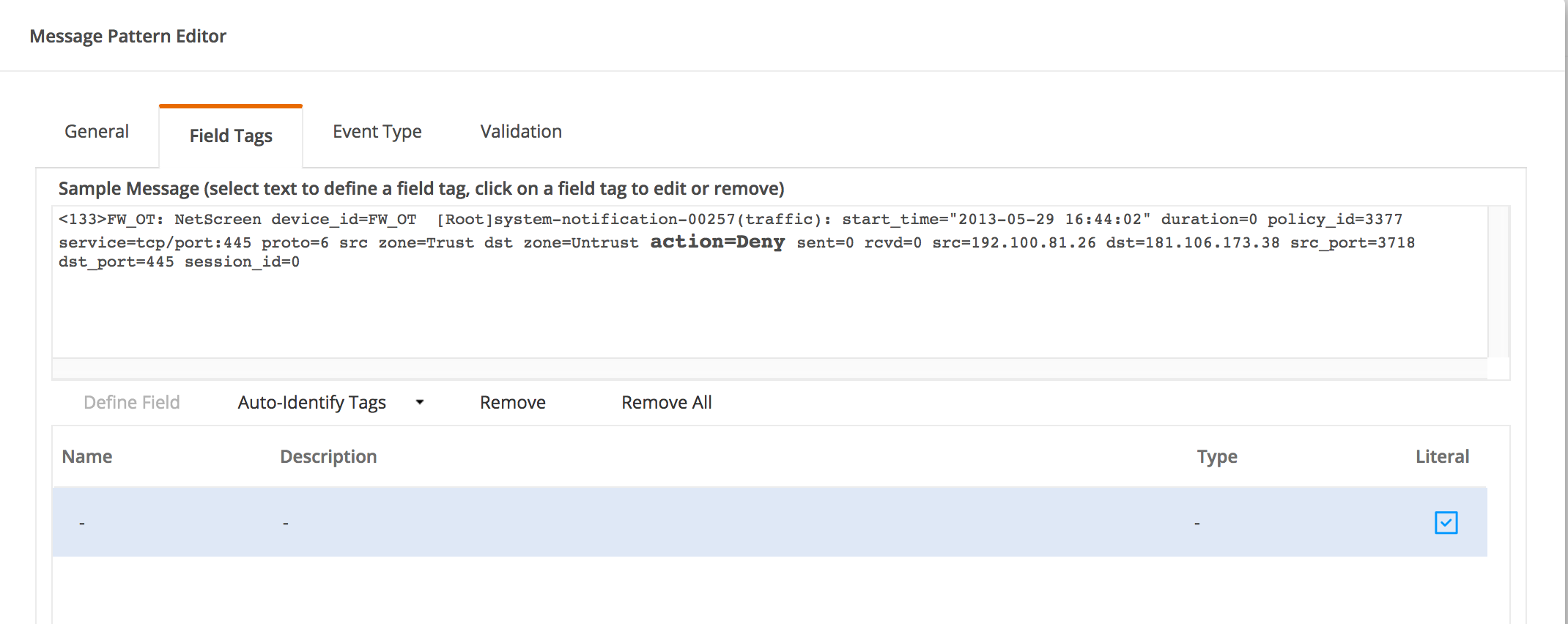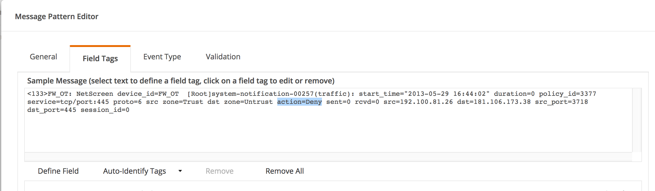 - Highlight a portion of the Sample Message you want to use as a Field Tag and click Define Field. The portion selected appears grayed out. The application recognizes your selection as one of 15 common tags in the Tag Library. Further identifying information appears in the Tag Attributes section. You can edit these entries, or select different choices from the Tag name: and Extract as: lists.