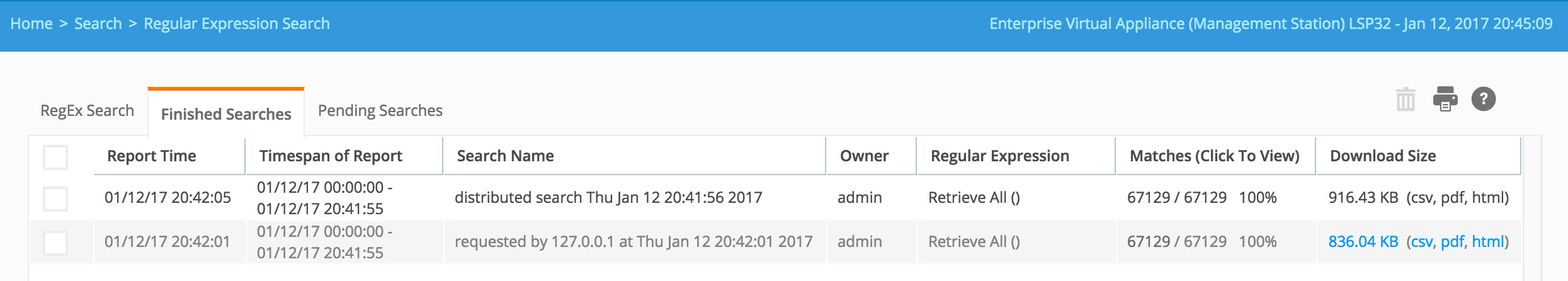 For Distributed RegEx Searches two results are displayed on the Management Station search page. This is because two searches were run on the Management Station; one for the Management Station and one for the combined results from the Management Station and the selected Remote Appliances. The Remote Appliances see only their local results.