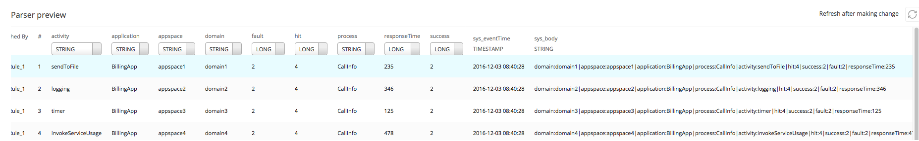Parser preview panel displays all extracted columns and their data types that are matched by the corresponding parsing rule. If you have configured downstream parsing, then the Parser preview panel displays the following information: