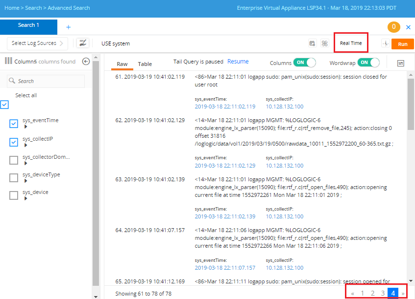- Similar to other search queries, you can click Pause or Resume at the top of the results page to control the streaming of logs.