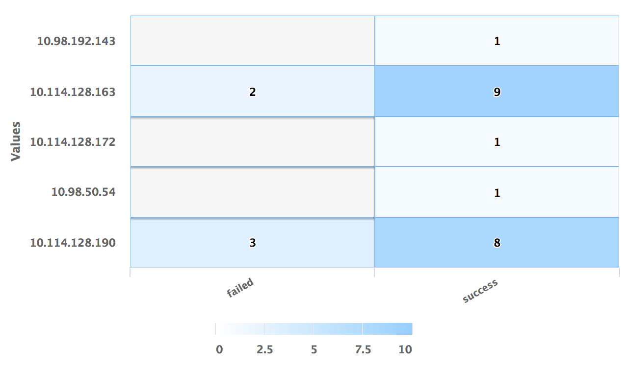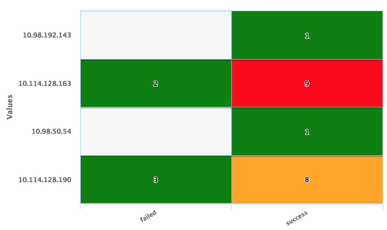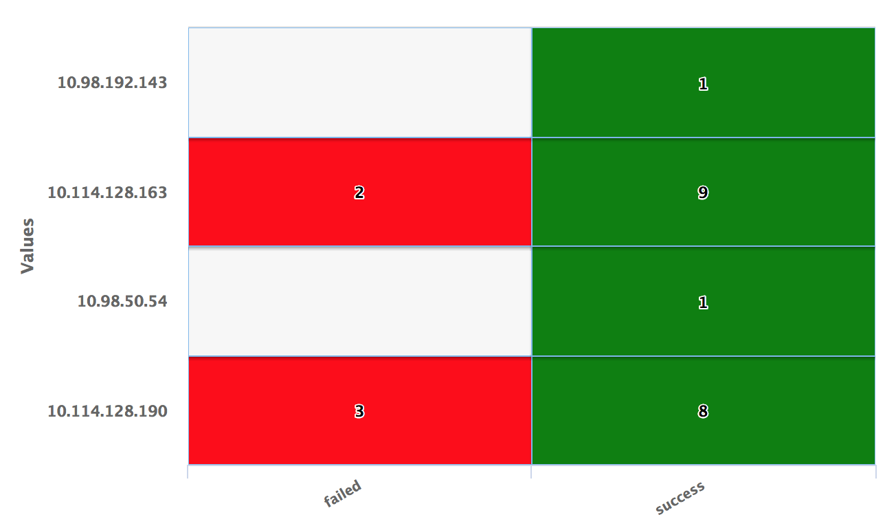 use LogLogic_Appliance | GROUP BY ll_eventStatus, ll_sourceIP | COLUMNS ll_eventStatus, ll_sourceIP, count(*), IIF(ll_eventStatus ='failed', 'red', 'green') AS color | ll_eventStatus is NOT NULL | (ll_eventStatus != '')