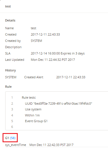 In the Details window, you can view alert details, history, associated correlation rule, and event group details. An event group count is displayed with a clickable number. For more information, see Viewing Event Group Details.