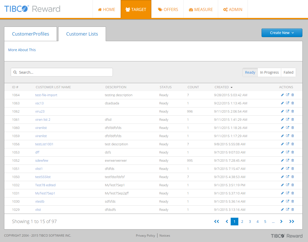 - The status of each list can be either Ready, In Progress, or Failed. Only lists whose status is Ready are currently available to use. The In Progress indicator should be displayed only for the period when a list is being processed. A list marked as Failed represents a failed attempt at creating a list. Failed lists should be deleted.